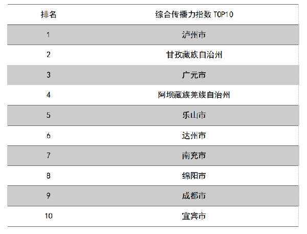 综合传播力指数评价维度由微信传播力、微博传播力、头条号传播力和抖音号传播力四个指标构成,权重分别为40%、25%、15%、20%。基于对四川省市(州)文化和旅游行政部门微信传播力、微博传播力、头条号传播力和抖音传播力的综合评价,10月综合传播力指数前十位排名为:泸州市、甘孜藏族自治州、广元市、阿坝藏族羌族自治州、乐山市、达州市、南充市、绵阳市、成都市、宜宾市。