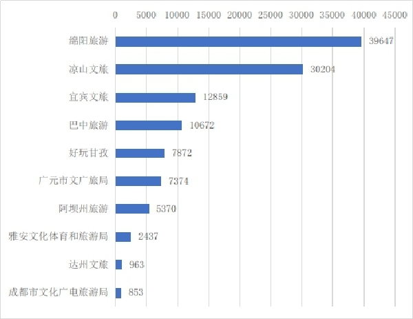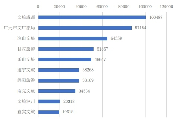 从阅读总量看,高于1万次的共12个微信公众号,最高的是文旅成都,有100487次。从平均每篇阅读量看,最高的是甘孜旅游,为1729人次。