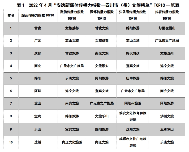 图1:2022年4月四川省市(州)级文旅新媒体综合传播力指数TOP10