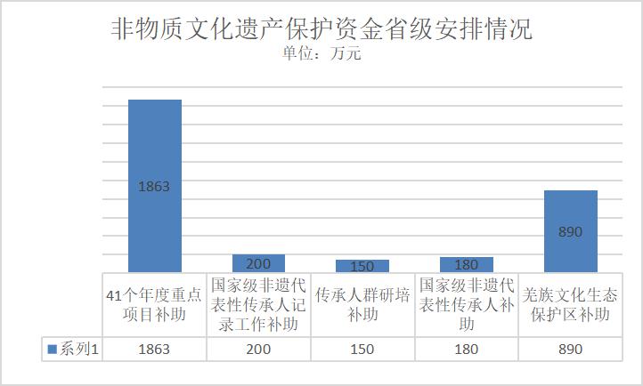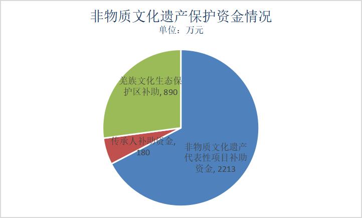 2021年中央下达我省非物质文化遗产保护资金共3283万元,分两批下达,《财政部关于提前下达2021年非物质文化遗产保护资金预算的通知》(财教〔2020〕199号)下达3083万元,《财政部关于下达2021年非物质文化遗产保护资金预算的通知》(财教〔2021〕61号)下达200万。其中,国家级非物质文化遗产代表性项目补助资金2213万元,传承人补助资金180万元,羌族文化生态保护区补助资金890万元。