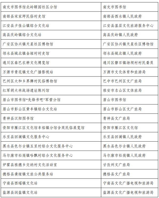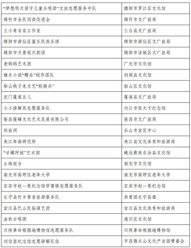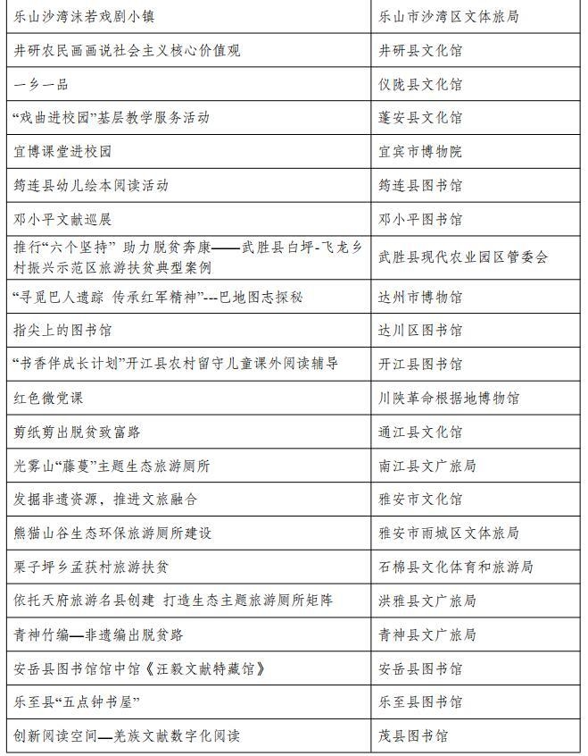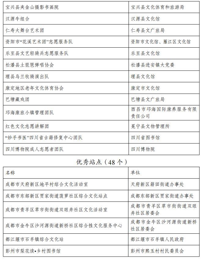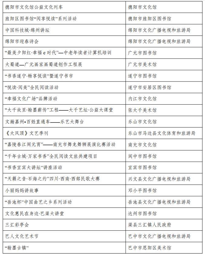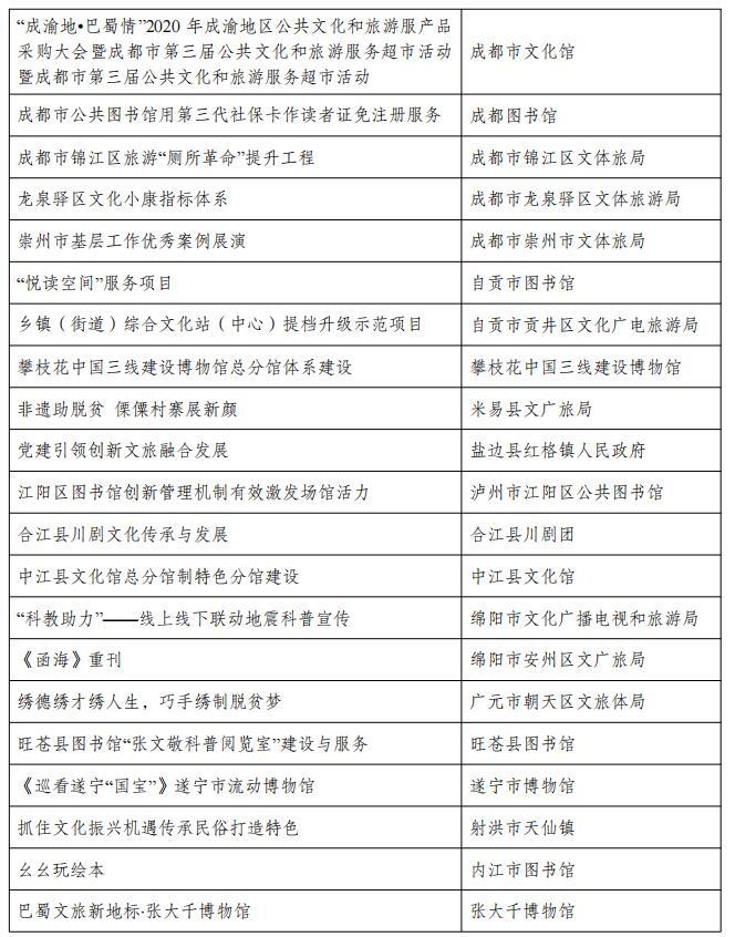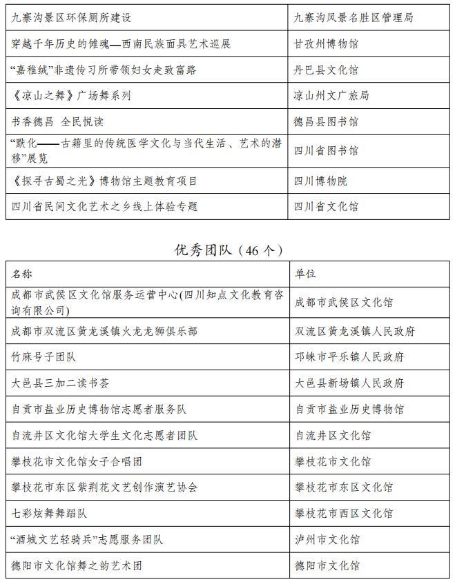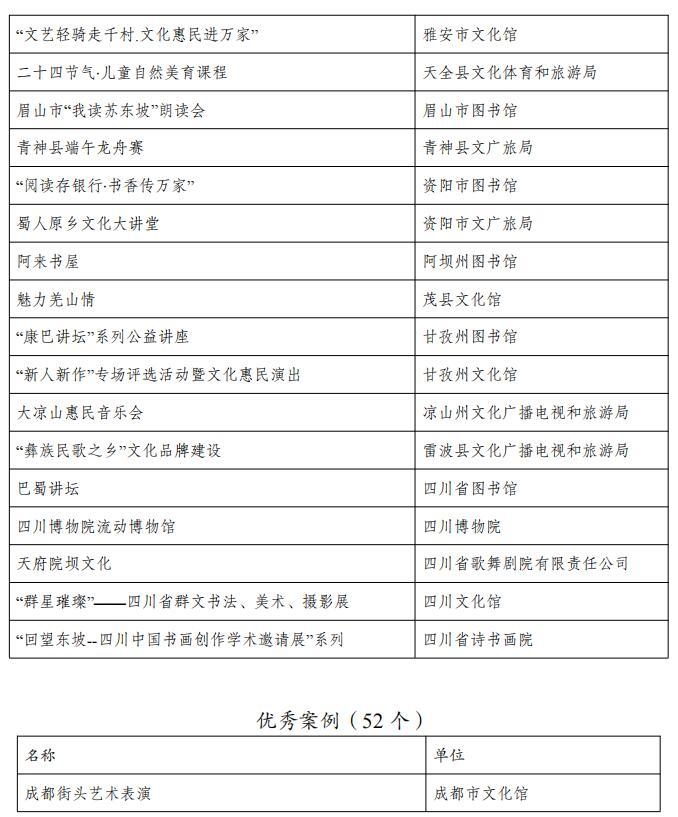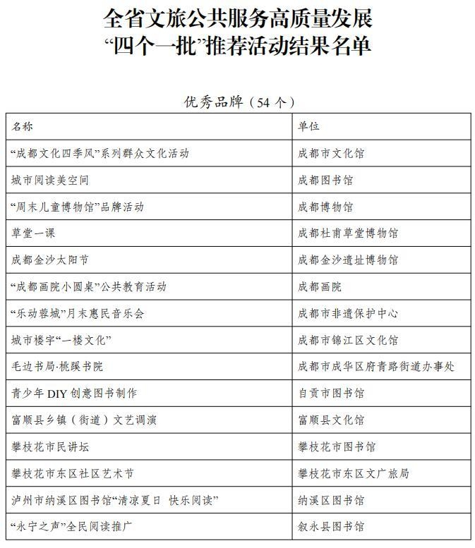 从名单上看,包括成都市文化馆“成都文化四季风”系列群众文化活动、成都图书馆城市阅读美空间等54个优秀品牌;自贡市图书馆“悦读空间”服务项目、攀枝花中国三线建设博物馆总分馆体系建设等52个优秀案例;成都市武侯区文化馆服务运营中心(四川知点文化教育咨询有限公司)、成都市双流区黄龙溪镇火龙龙狮俱乐部等46个优秀团队;成都市天府新区地平村综合文化活动室、成都市东部新区贾家街道菠萝社区综合文化站点等48个优秀站点。