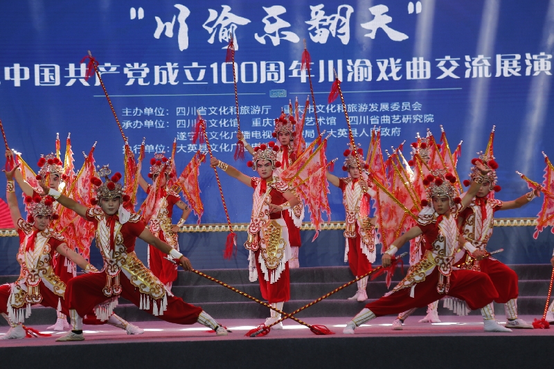 2021年5月,“成渝地·巴蜀情”川渝乐翻天——庆祝中国共产党成立100周年川渝戏曲交流展演活动在遂宁市大英县举办。四川金钱板《四川麻辣烫》《张飞买锅盔》、小品《宅家记》《烟火成都之吆喝》、四川清音《竹颂》、长绸木偶《化蝶》、快板《我唱山歌给党听》、相声《学外语》、四川谐剧《一分都不能少》等文艺演出依次亮相,在吸引众多观众拍手叫好的同时,也展示了川渝地区的民俗风情,让基层文化活动“闹”起来、热起来。