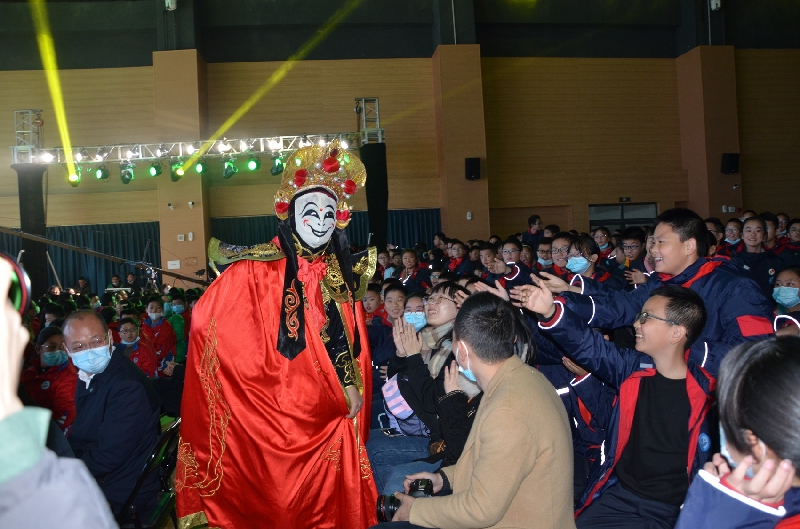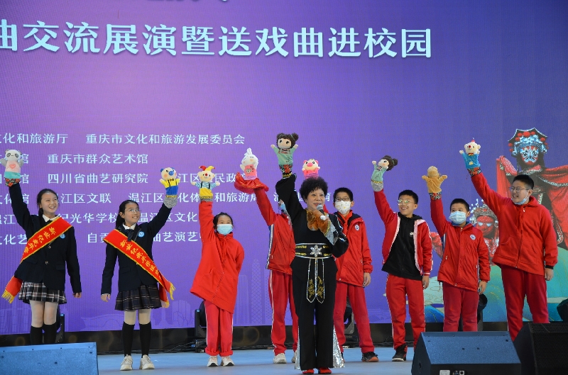 2020年11月27日,“川渝乐翻天”川渝地区戏曲交流展演暨送戏曲进校园在成都市温江新世纪外国语学校举行。这场瞄准年轻学生群体的交流活动,精彩不停。四川金钱板、喜剧小品、四川盘子表演唱、双人快板、木偶变脸等各种艺术形式轮番登场。除了表演,科普曲艺知识也是活动内容之一。在成都市温江新世纪外国语学校的活动现场,四川金钱板表演者就贴心科普了金钱板的打法和历史渊源。川剧变脸表演者还走下台去,和学生互动。更有学生亲自上台挑战体验,演出现场笑声、掌声不断。