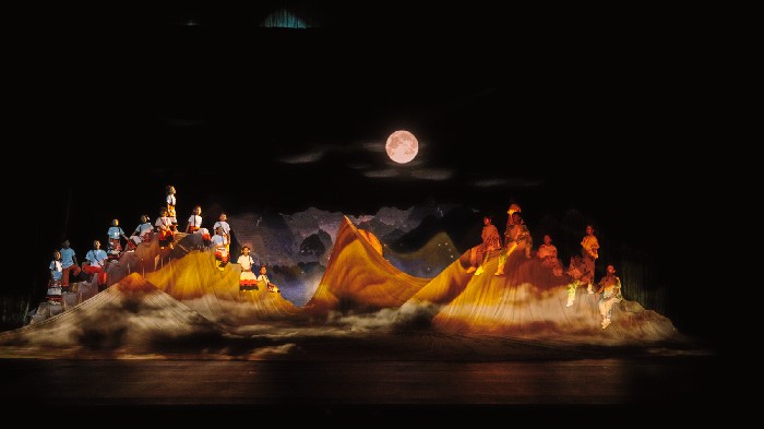 演出延续了大凉山彝族的孩子们与汉族儿童共同演唱的形式,并加入凉山州歌舞团的成年舞者,他们以“托举”动作象征代际之间的传承。“这种托举既有看得见的,也有看不见的。台上除了表演的舞者,还有幕布下把孩子们托起来的哥哥们,作为凉山州歌舞团的专业舞蹈演员,却承担了不露脸的工作。这既是大人对孩子的托举,也呼应了歌曲中一代一代无休止的传承求索精神,表达了中华民族在仰望星空中不断前行的意象。”谭淇尹解释道。