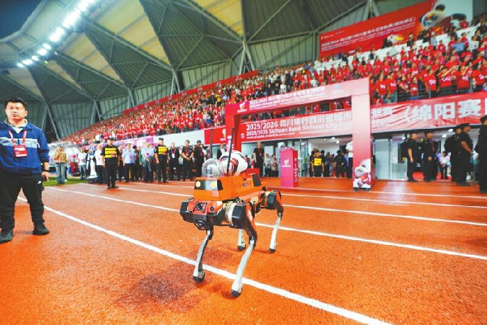 “川超”绵阳主场比赛开球仪式,“绵阳造”机器狼携球入场。 郭超英 摄