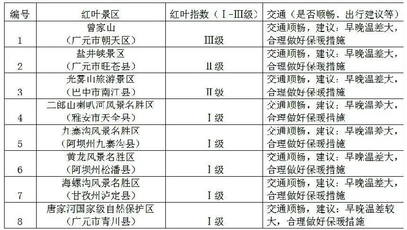 值得一提的是,近期较适宜观赏红叶的景点主要分布在四川省东北部曾家山、盐井峡、光雾山景区。但今年受闰月和气候等因素影响,预计红叶观赏期较往年推迟10~15天。