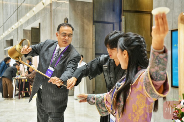 30日上午,天府国际会议中心的论坛举办地,与会专家学者步入会场前,被专门布置的四川文化遗产保护实践展吸引了眼球。展览上不仅有青城山、都江堰等四川文化遗产的精美图片,还带来了长嘴茶壶等非遗表演以及石窟数字化利用的项目展示,不少海外嘉宾借机体验了一把茶艺表演。