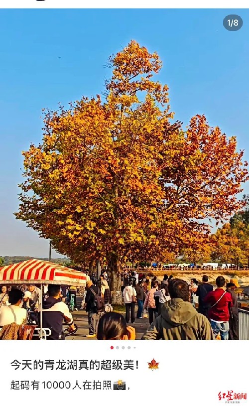 “青龙湖真的超级美,起码有10000人在拍照”“梧桐树太有氛围感了”“最近的青龙湖热闹非凡,梧桐树下长满了人”……大家在网络上发布的游玩、拍摄攻略中,梧桐叶在阳光下泛着金光,树影婆娑间挤满了拍照的人群。