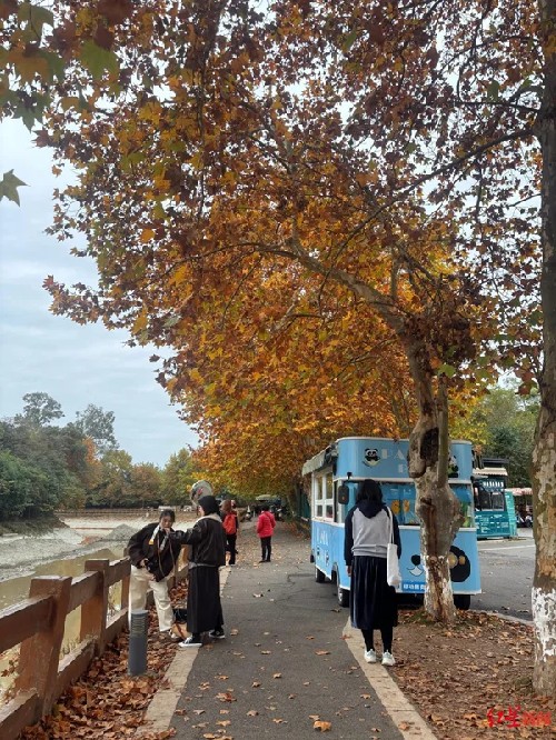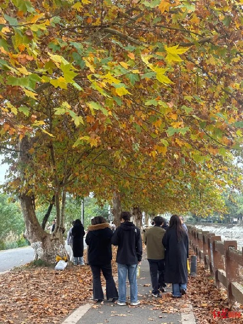 即便是工作日的阴天,仍有十余位市民游客在打卡拍照。人们或倚着河畔栏杆与梧桐合影,或坐在落叶中营造氛围,就连路过的骑行者也忍不住停下车,举起手机记录这片限定美景。
