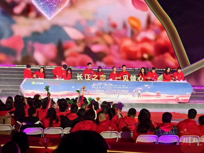 11月22日晚,爱意弥漫宜宾长江公园,520对情侣齐聚于此,在“长江之恋 一见倾心”浪漫之夜活动中,以江水为证,许下爱的誓言。伴随着《我可以》等经典情歌旋律的响起,由宜宾联合泸州、眉山共同举办的为期一个月的2025“长江之恋 三城有囍”浪漫之旅系列活动迎来高潮,宜宾、泸州与眉山三地联合发布了浪漫旅游地图。