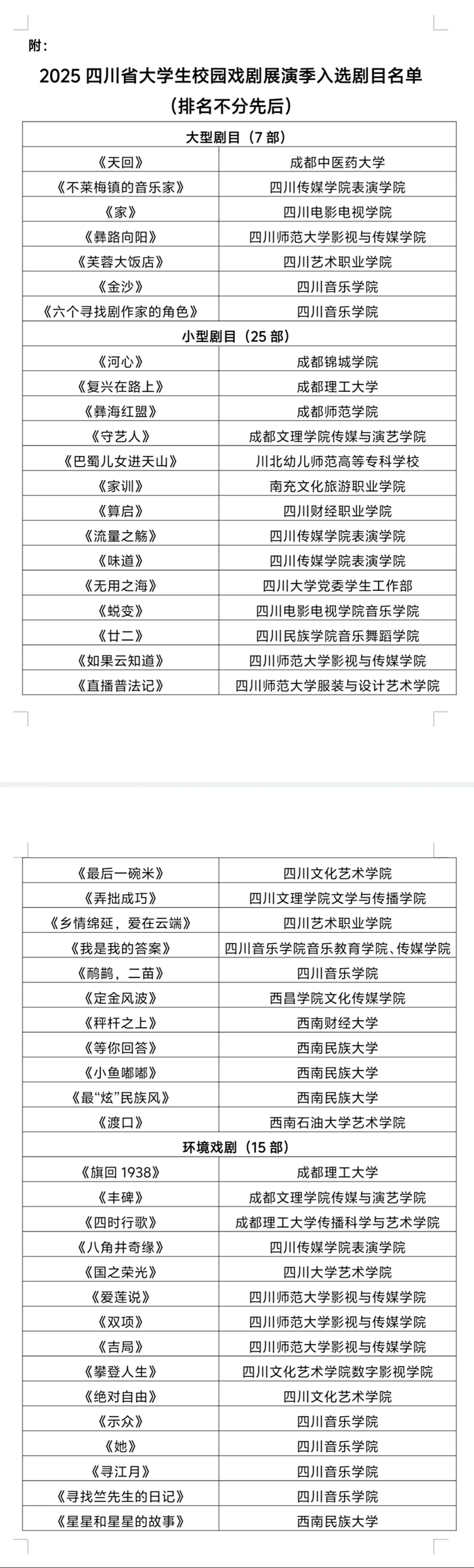 据悉,2025四川省大学生校园戏剧展演季将于11月19日-20日在成都新声剧场举行开幕式和小型剧目展演,11月21日-27日在成都理工大学、成都艺术职业大学举行大型剧目展演,11月22-30日期间在成都市青白江区城厢古城举行环境戏剧展演。届时,同学们将以戏剧之名一起逐梦青春,用饱满的热情给大家带来精彩的剧目演出。