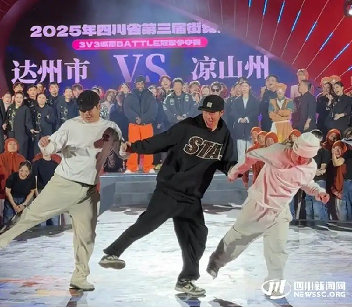 开场便是本次大赛3V3城市BATTLE赛的终极对决,达州队与凉山队在这场对决中展开激烈角逐。达州队巧妙地运用各种街舞元素,每一个动作都精准到位,引得现场观众阵阵欢呼。凉山队也不甘示弱,他们更是将彝族达体舞的韵律与街舞的节奏相融合,展现了别具一格的表演形式。随着比赛的推进,现场气氛愈发激烈。最终,经过多轮精彩的比拼,达州队凭借着更加稳定且出色的发挥,赢得了3V3城市BATTLE赛的冠军。