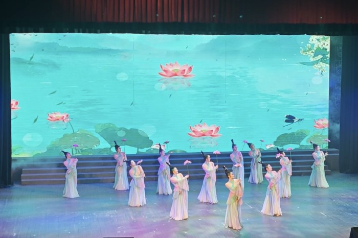 12月19日晚,由12名来自泸县农民演艺团队的演员,在泸州市2026年新年舞蹈展演活动上,带来了跨界融合舞台剧中的一个作品《采莲舞》。跟随音乐节奏,演员身上浅绿色的裙摆,与手中粉嫩的荷花格外和谐。