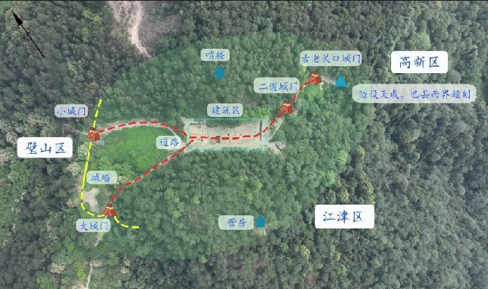 重庆市成渝古道老关口遗址是集城防、道路及生活设施为一体的关隘遗址,是明清时期成渝古道东大路沟通缙云山脉东西两侧白市驿和来凤驿重要节点,对于研究成渝之间的商贸往来、人群迁徙、文化互动等具有重要意义。