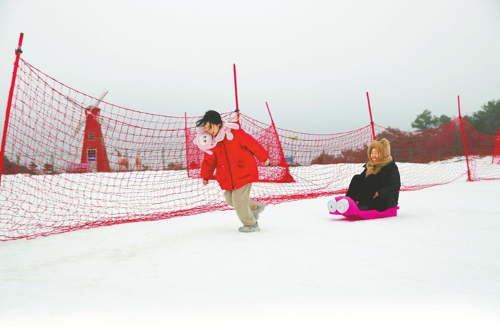 游客在巴山大峡谷罗盘顶滑雪场玩雪。 宣汉县委宣传部供图