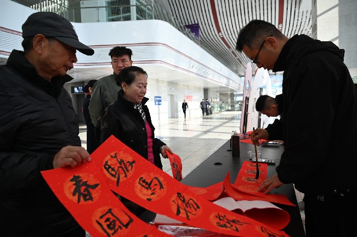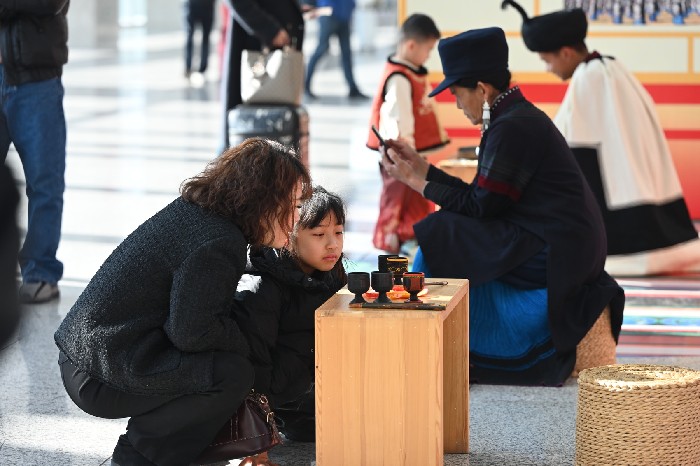 10时50分,列车抵达西昌西站,此时候车大厅已变身为沉浸式文化体验空间。文化展示台,非遗代表性传承人正用精湛的技艺敲打银饰、勾勒漆器;服务台旁,铁路书法爱好者为旅客免费书写春联和“福”字。在互动展演区,月琴、口弦演奏和彝族歌曲串烧吸引众人驻足,“朵乐荷”表演更是将现场氛围引入高潮。特色服饰试穿和“心愿便利贴”等活动也备受欢迎。