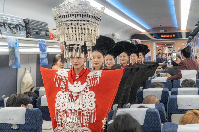 “彝家有传统,待客先用酒,彝乡多美酒,美酒敬宾朋……”欢快的彝族歌曲在动车上唱响。2月11日上午,从越西站开往西昌西站的D251次列车上,身着彝族盛装的演员穿行于车厢,为旅客讲解风光,献上歌舞,将车厢变成了展示大凉山风土人情的“移动展厅”。这是“流动的中国·彝路向春”春节主题宣传活动的一部分,铁路与当地文旅部门以此方式,为春运旅途注入浓郁的文化年味。