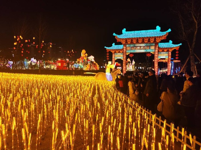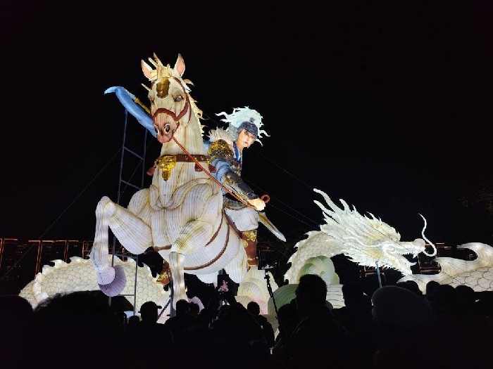 《人面桃花相映红》灯组中的桃花仙子会“眨眼”互动,《子龙攻坚尤可效》灯组将赵子龙的英雄气概展现得淋漓尽致……游客们举着手机边走边拍,孩子们在灯海中欢笑奔跑。