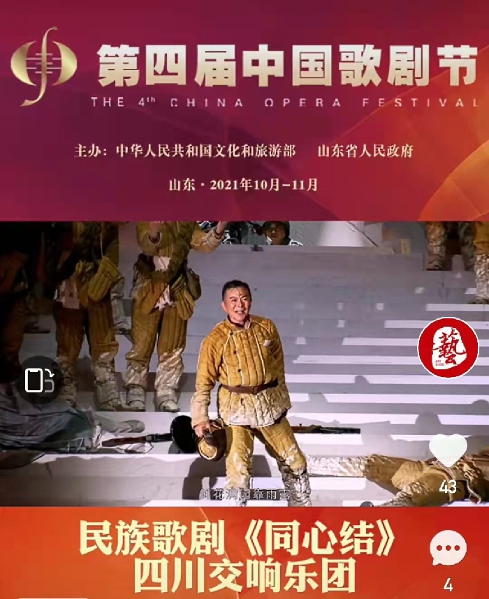 11月25日19:30,由文化和旅游厅、德阳市委市政府出品,四川交响乐团、德阳市文化广播电视和旅游局、中江县委县政府制作,四川交响乐团、四川人民艺术剧院、省歌舞剧院等单位联合演出的歌剧《同心结》在第四届中国歌剧节线上直播平台展演。