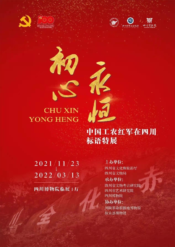 为传承和弘扬红色基因,献礼中国共产党百年华诞,11月23日,由文化和旅游厅、省文物局主办,省文物考古研究院、省艺术研究院、四川博物院承办的《初心永恒——中国工农红军在四川标语特展》在四川博物院开展,展览将持续至2022年3月13日。