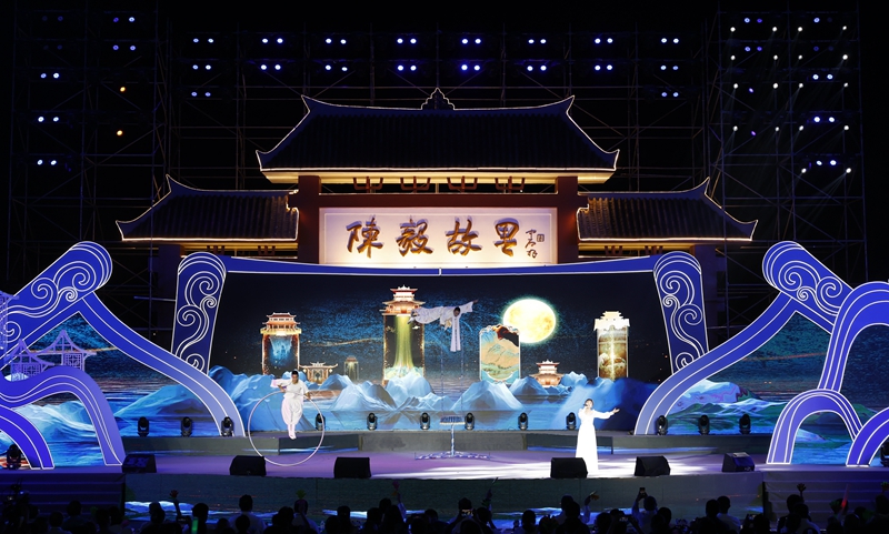 “海上生明月,天涯共此时”,自古以来,人们就将团圆、思念等浪漫情思寄托于月。当天的演出也重点突出了这份缱绻诗意,以“月”元素传递佳节美好。晚上20:10时,夜幕渐浓,火红的灯光映衬着舞台,随着歌舞《追寻》,集中展演拉开了帷幕。围坐四合,清风绕身,露天舞台上,歌舞《月亮女儿》、杂技《左手指月》等接续登台。屏幕上,圆月照人,身着华服的演员随月起舞,或旷达,或婉约的舞姿,将人们带入浪漫的月色之境。一曲舞罢,仿若拂去尘世之扰。