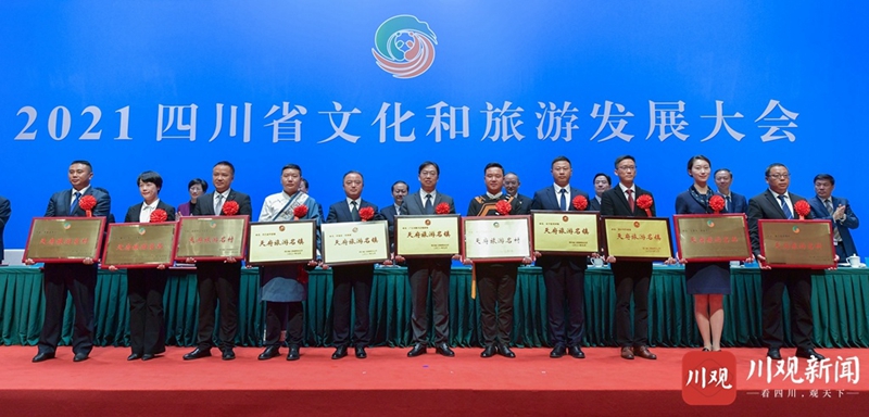 会上,省委常委、宣传部部长甘霖宣读第三批天府旅游名县、首批天府旅游名牌(名镇、名村、名宿、名导、名品)命名文件,彭清华逐一向获得命名的天府旅游名县授牌,彭清华、黄强、邓小刚等向首批天府旅游名牌获得者代表授牌。九寨沟县、省文物考古研究院、华强方特集团、交通运输厅负责同志作交流发言。会议宣布南充市为2022四川省文化和旅游发展大会承办地并授旗。