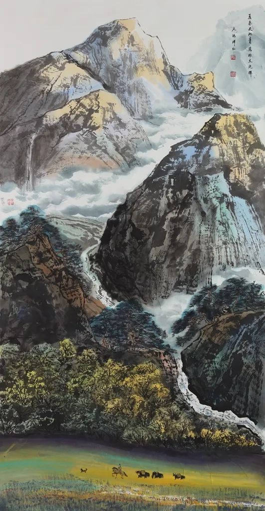 作品赏析:《春来天地清,万物生光辉》,这幅画创作于2022年夏天。这幅画所表现的是四川省康巴地区的景色。万物在春天充满蓬勃生机,牧民赶着牦牛从草地走过,清澈的泉水从山间欢快而下,万物生辉。寓意国家更加富强,老百姓生活更加美满,更加幸福,这是画者所要表达的心情。