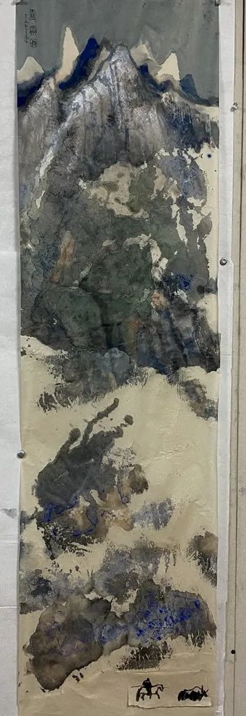 创作者自述:“七十岁后,我对泼彩泼墨山水画进行了大胆尝试,创作了《牧马天山》《明皇幸蜀》《牛背观云》《雪山归牧》等泼彩山水作品。这次中国艺术节入展的《雪霁图》,创作的起因乃是一幅小小的‘牧归图’,生发而成。此前曾画过一张大幅雪景图,也是因为点景人物那精彩地数笔而诱发出创作的动机。当时试画过几张牧歌点景人物,留下其中之一张,乃成为这幅《雪原归牧图》的创作‘诱因’或‘酵母’,由此而产生出这张大幅泼彩《雪原归牧图》。”