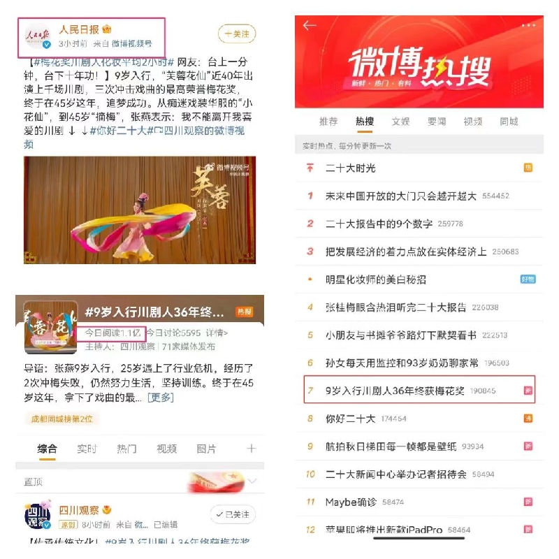 10月17日,由四川省文化和旅游厅、四川广播电视台共同主办的川剧主题栏目《好戏连台》以“张燕代表:我是‘芙蓉花仙’”“9岁入行川剧人36年终获梅花奖”为题,在四川观察、四川文旅频道全媒体平台推出后,被《人民日报》微博视频号以“梅花奖川剧人化妆平均2小时”为题转发,荣登热搜第七,单个话题流量破1.1亿人次。