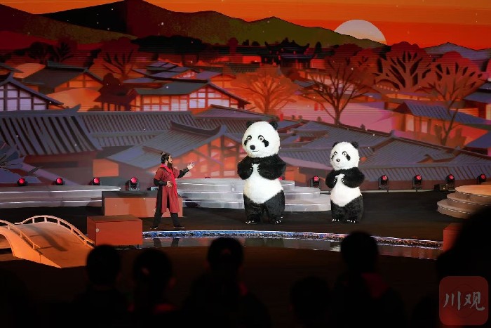三星堆神树造型的主舞台上,说书人以“三寸醒木”串联起十二盏代表不同时辰的灯笼,从辰时绵阳越王楼的米粉飘香,到寅时稻城亚丁的星空璀璨,安逸熊猫与科技熊猫两位虚拟主持人带领观众“穿越”四川十二地标的烟火人间,向全球观众勾勒出一幅独属于四川的光影图景。