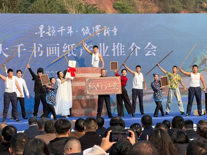 现场,12位全国书画名家联袂创作的12米诗书画卷正式赠予夹江,作品笔墨精妙,既展现艺术魅力,又勾勒夹江发展图景;大千书画纸新品同步发布,在传承千年技艺基础上迭代升级,精准对接市场需求;举行首批手工造纸作坊及品牌经销商授牌仪式。