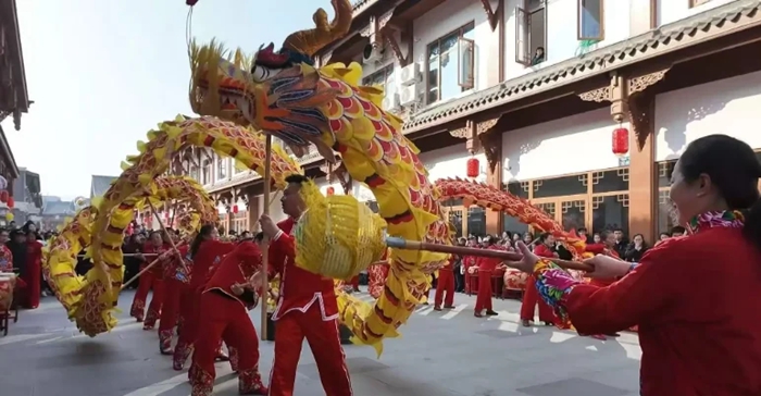 不多时,投壶区排起了队,掷骰区围满游客,半人高的大骰子被高高举起又轻轻落下,点数一出,欢呼声顿时炸开;戏台上,川剧、黄梅戏、现代京剧……传统绝艺与潮流互动碰撞出奇妙火花这座千年古城真的变成了一个充满惊喜的剧场;忽然间,鼓点急促,“咚!咚!咚!”——舞龙队伍从街尾涌来,金鳞翻滚,人群自动让出通道,又紧跟着追上去,笑声、叫好声、快门声混成一片。