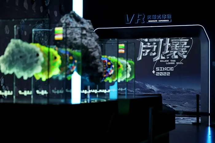 为让抽象的月壤科研成果可感可知,展览运用AR、VR、显微摄影、微米CT扫描等先进技术,划分两大核心区域,打造全维度体验空间。其中,科普展览区设置“叩问——月壤的科学揭秘”“洞悉——月壤的真实样貌”“揭秘——月壤的无穷价值”三大板块,通过模拟月壤标本、高清显微影像、互动装置等展品,系统解读月壤的科学属性与研究意义;沉浸体验区则推出“月宫计划”VR项目,观众可身着虚拟宇航服漫步月球静海,触摸月壤微观结构、驾驶月球车完成科普任务,沉浸式感受月球探索的奇妙旅程。