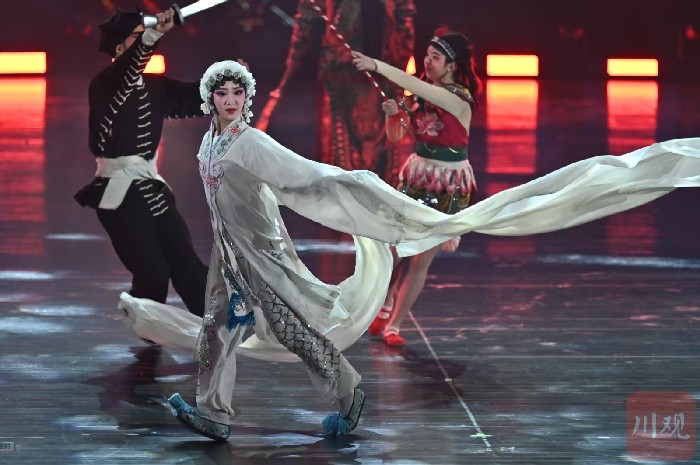 《死水微澜》《变脸》等经典剧目选段,与新创戏歌《朝天子》、国风变脸舞蹈《风华鉴》、武戏新编《白蛇情·破禅关》等融合节目同台辉映。陈智林、陈巧茹等多位川剧名家献艺,青年演员在动态光影技术的助力中列阵登场,中小学新苗新秀登台亮相,此外,晚会还邀请京剧、越剧、昆曲等剧种名家、文化名人参与,共同展现戏曲之美。