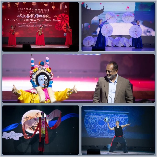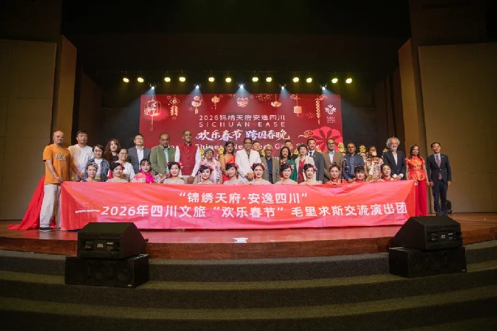 四川文旅“欢乐春节”艺术团倾情奉献,为毛民众带来主题为“锦绣天府·安逸四川”的精彩演出。经过精心策划,跨国春晚分为“巴蜀·锦绣”“民族·绚丽”“九州·风华”“多彩·互鉴”四个篇章。演出在戏曲舞蹈《百花争艳》中绚丽开场,水袖飘、摇、穿、搭、卷、抓、甩、抖、扬等精湛技艺,将观众带入锦绣四川百花齐放的春日盛景。彝族群舞《节日盛装》、羌族舞蹈《云上》等节目,展现了中华民族多元文化的绚丽风采。魔术《飞花令·伞》、杂技《坛技—青花韵》、木偶非遗展示《长绸舞》、川剧特技《巴蜀神韵—变脸》轮番上演,赢得观众阵阵惊叹。器乐演奏《采花》《溜溜情》《春节序曲》让毛观众领略到中国民乐的灵动与绚丽。“多彩·互鉴”篇章通过中国艺术团演奏毛里求斯名曲,以及毛里求斯中国文化中心当地学员演绎中国舞蹈的形式,给现场观众留下深刻印象,生动诠释了中毛文化交流的蓬勃活力。