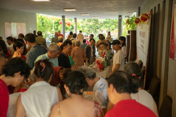 剧场外还设置了四川非遗文创展及非遗展示区,通过年画拓印、蜀锦、蜀绣、竹编、油纸伞等四川非遗精品、熊猫文创产品以及旅游信息手册,向毛民众展示了四川丰富的文化和旅游资源,表达了欢迎毛各界朋友到中国四川来旅游、感受中国式现代化的万千气象的友好意愿,吸引大量观众驻足流连。人们互致新春祝福,沉浸式体验中华文化魅力,在祥和的氛围中共同欢庆马年的到来。