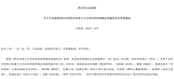 2月7日,四川省人民政府网站公布《四川省人民政府关于公布获得2024年度四川省重大文艺项目扶持和精品奖励作品名单的通知》。