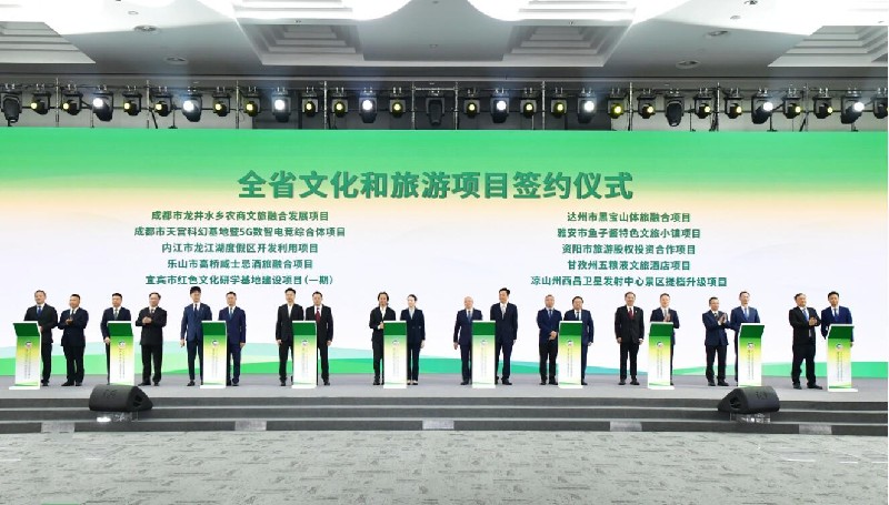 在参会嘉宾共同见证下,会上成都市龙井水乡农商文旅融合发展项目、成都市天宫科幻基地暨5G数智电竞综合体项目、内江市龙江湖度假区开发利用项目、乐山市高桥威士忌酒旅融合项目、宜宾市红色文化研学基地建设项目(一期)、达州市黑宝山体旅融合项目、雅安市鱼子酱特色文旅小镇项目、资阳市旅游股权投资合作项目、甘孜州五粮液文旅酒店项目、凉山州西昌卫星发射中心景区提档升级项等10个项目进行了集中签约。